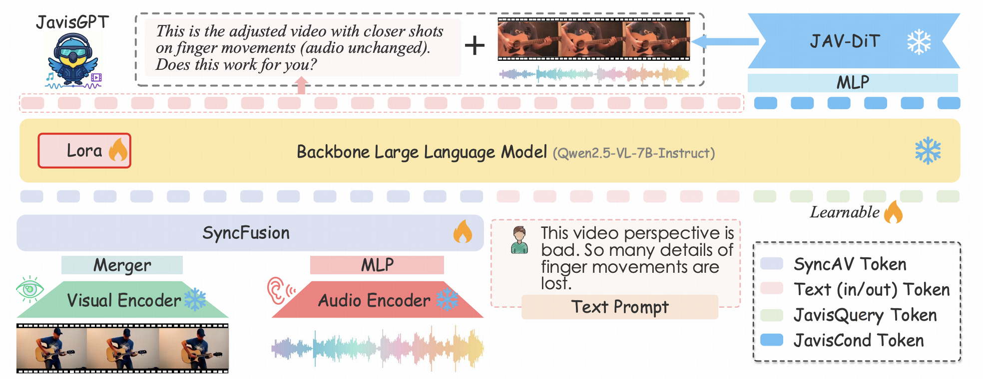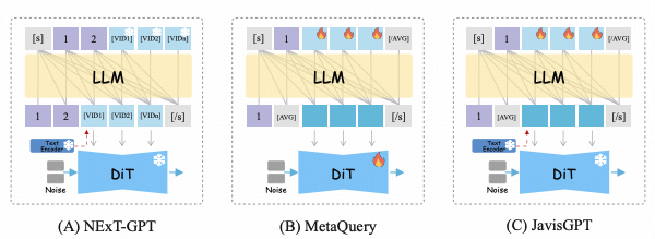 这一环环相扣的闭环架构设计, 使JavisGPT成为首个在单一网络权重下,同时具备高保真多模 态感知与高一致性生成能力的通用多模态大模型。