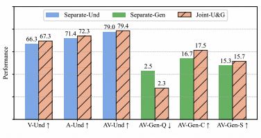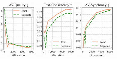 特别是在音画同步性和文本一致性两个维度上,联合训练的曲线始终包裹着分离训练的曲线。这表明,在统一的语义空间内进行多任务学习,能够有效规避局部最优解,帮助模型更快地掌握复杂的多模态交互规律。
