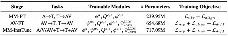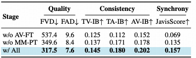 通用的多模态预训练虽然赋予了模型基础的感知能力,但只有通过专门的音视频对齐微调,模型才能捕捉到毫秒级的物理同步规律。 每一个训练阶段都是构建高保真有声视频生成能力必不可少的基石。