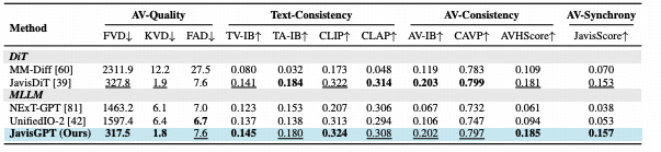 为了验证JavisGPT的有效性,研究团队在多个权威基准上进行了严苛的测试。 实验结果表明,该模型在理解与生成两个维度上均取得了SOTA性能。
