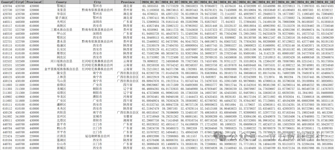 基于原始的逐日相对湿度栅格数据,我们采用国家地理信息公共服务平台(天地图)发布的审图号为GS(2024)0650号的2024年省市县三级行政区划Shp数据(可查看之前的文章获悉详情),对每个省\每个地级市\每个区县内的栅格值进行了求平均数处理,得到了省市县三级的逐日的相对湿度数据!
