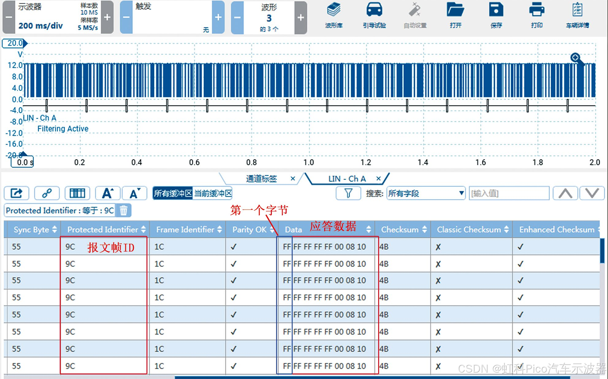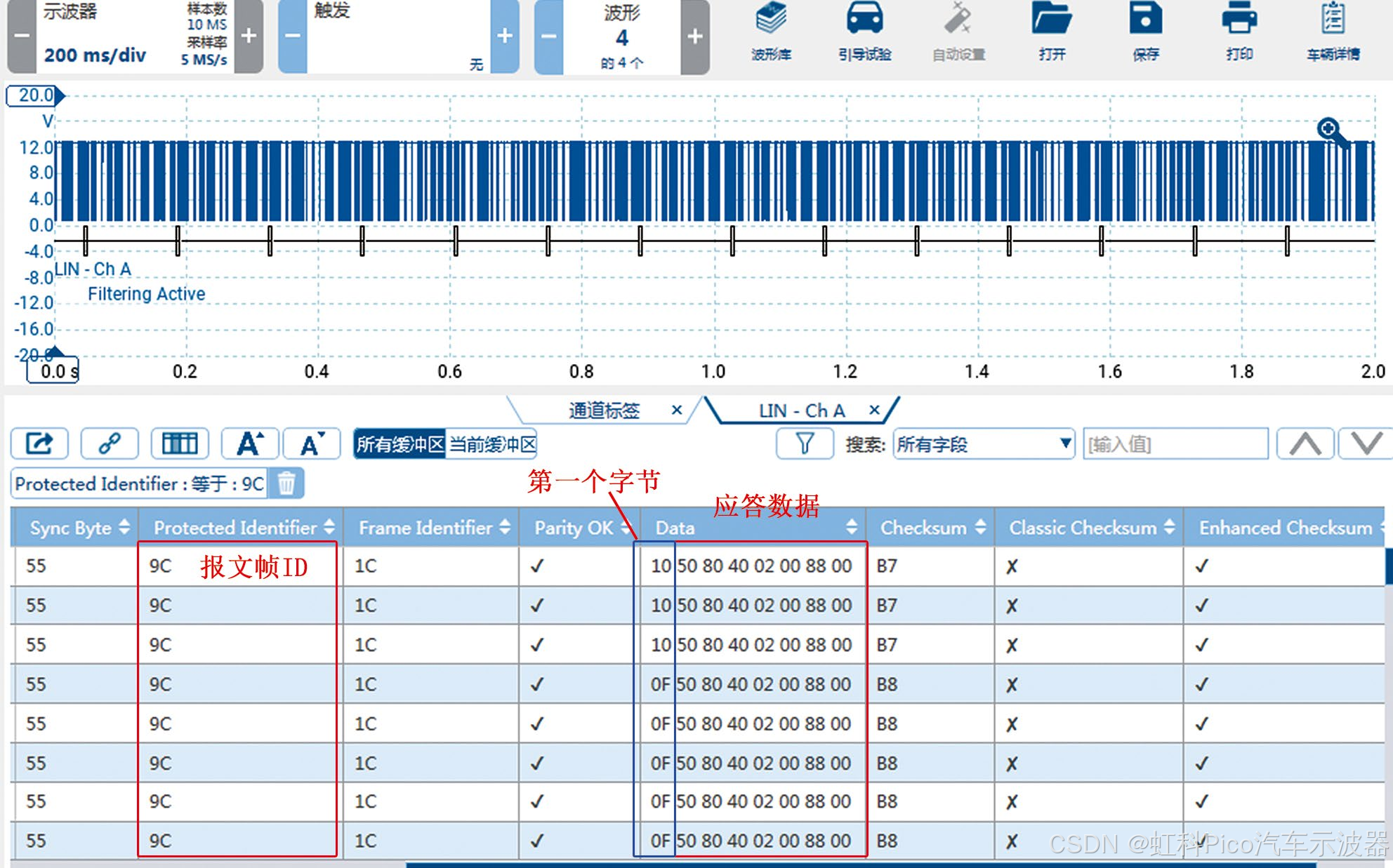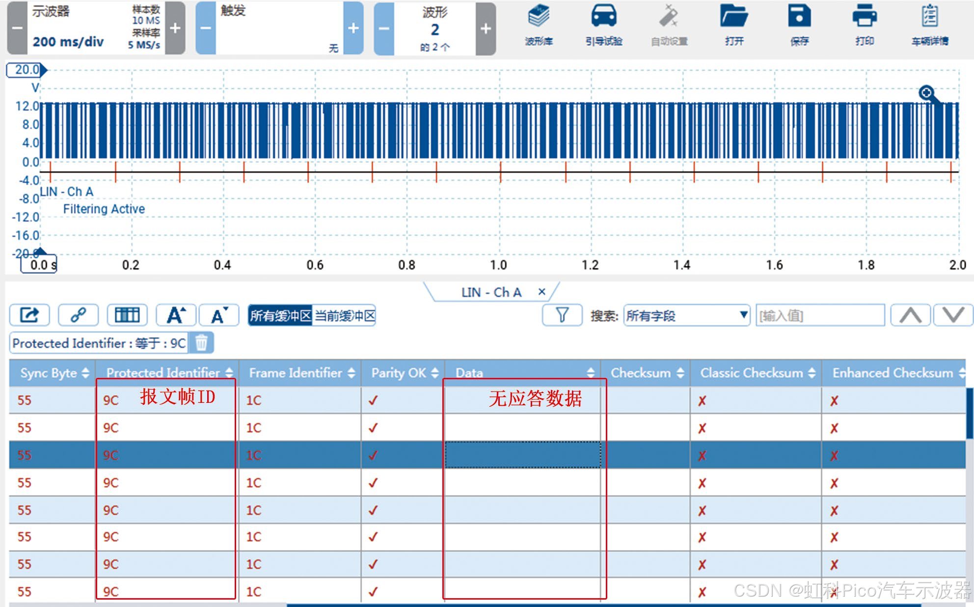 尝试用故障检测仪读取B31/4数据,未发现相关数据项。用万用表测量B31/4的供电和搭铁,均正常。用虹科Pico汽车示波器测量B31/4 LIN总线上的信号波形(图6),发现LIN总线上有信号发送,高电位约为12.9 V,低电位约为1.1 V,无明显异常;对信号进行译码,发现共有15个数据帧ID;脱开B31/4导线连接器后再测量LIN总线上的信号波形并进行译码,通过对比发现,未脱开B31/4导线连接器时,报文帧ID 9C有应答数据(图7),而脱开B31/4导线连接器后报文帧ID 9C变为无应答数据(图8),由此推断报文帧ID 9C对应B31/4。