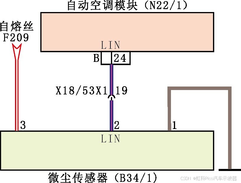 B31/4安装在驾驶人侧脚部位置区域(图4),其导线连接器上共有3根导线(图5),分别为电源线、搭铁线及LIN总线。B31/4负责监测车内微尘含量,并通过LIN总线将微尘含量信息发送至N22/1。