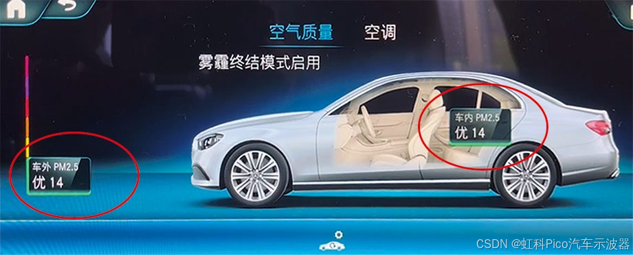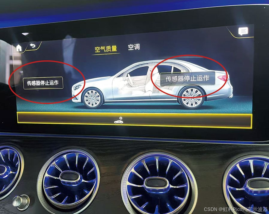 一辆2021款奔驰E260L车,搭载M264发动机,累计行驶里程约1.5万km。车主反映,多媒体显示屏上的空气质量选项提示"传感器停止运作"(图1),正常情况下应显示PM2.5指数(图2)。