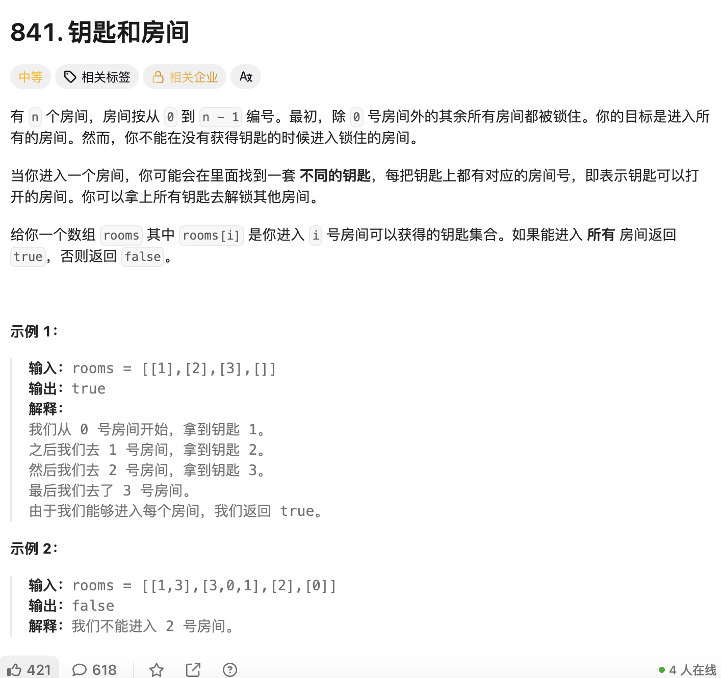最初,除 0 号房间外的其余所有房间都被锁住。你的目标是进入所有的房间。然而,你不能在没有获得钥匙的时候进入锁住的房间。