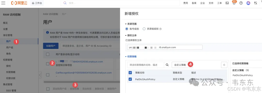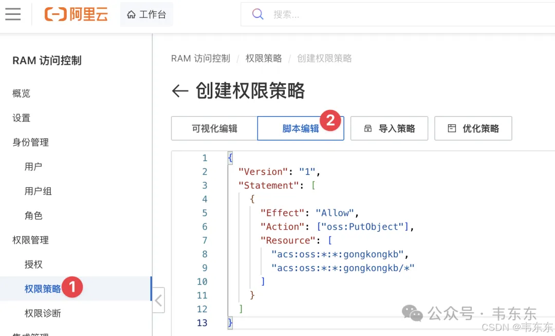 主账号的 Key 权限太大,可以读写删除任何数据,风险肯定不能接受。解决方案是在阿里云 RAM 创建一个最小权限子账号,只允许 PutObject (上传),不允许GetObject (读取)、DeleteObject (删除)、ListBucket(列举)。
