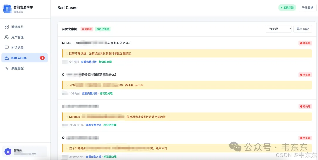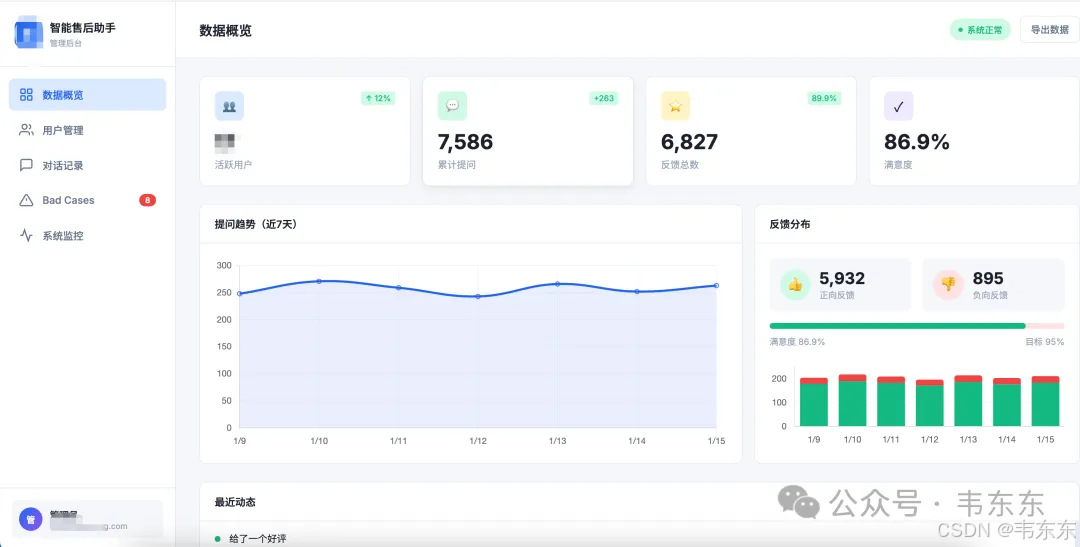 系统部署在客户内网,但初期调试阶段需要远程监控实际使用情况:用户问了什么、检索了哪些文档、回答质量如何、有没有点踩。这些数据是后续优化的基础。