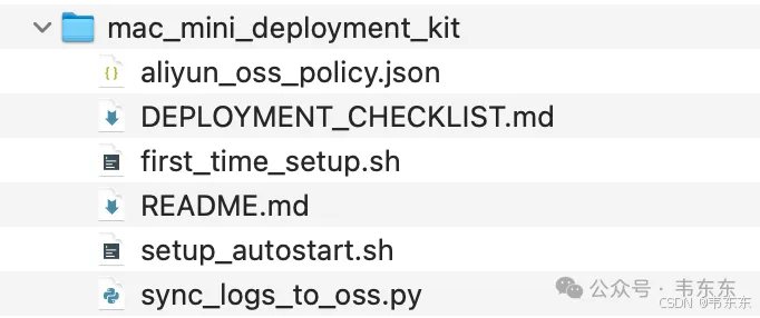 做了几个 Mac Mini 部署项目之后,沉淀下来一套可复用的部署工具包。这套工具包主要包含三类内容: