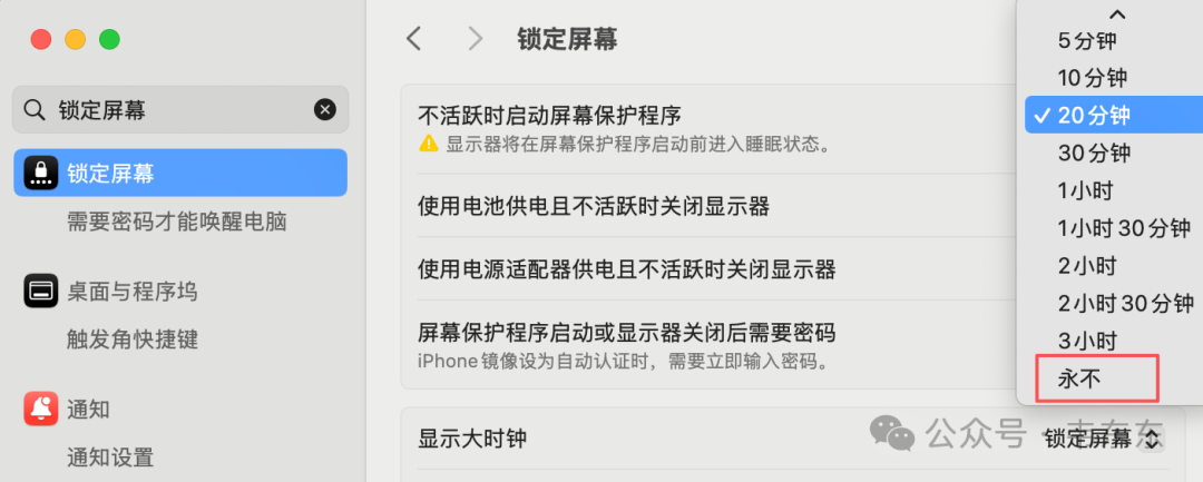 系统设置 → 锁定屏幕 → 「不活动时关闭显示器」设为「从不」