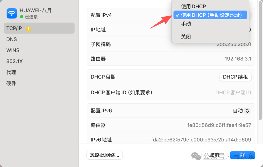 这是最直接的做法。在 Mac Mini 上操作:系统设置 → 网络 → Wi-Fi(或以太网)→ 详细信息 → TCP/IP → 配置 IPv4 选择「手动」,然后填写 IP 地址、子网掩码、路由器地址。