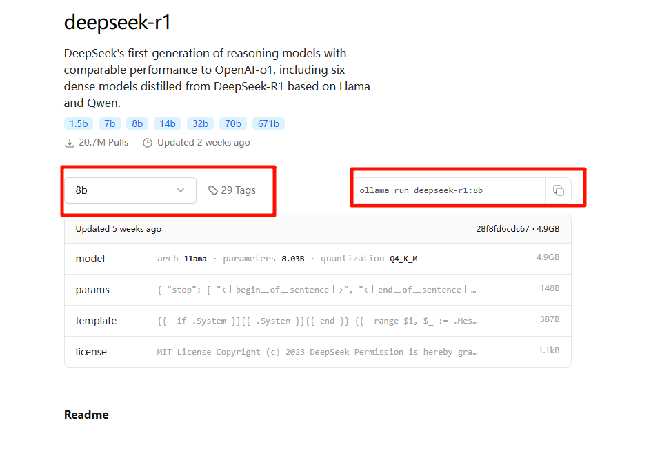 在Ollama官网中找到DeepSeekR1模型,选择相应参数的模型,复制命令。