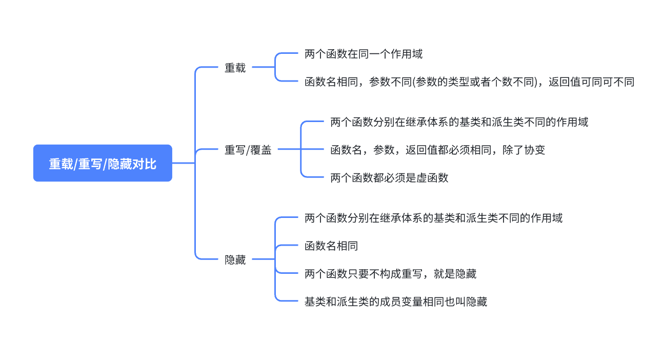 - 基类的析构函数为虚函数,此时派生类析构函数只要定义,无论是否加 virtual 关键字,都与基类的析构函数构成重写。编译后析构函数的名称统一处理成 destructor,所以基类的析构函数加了 virtual 修饰,派生类的析构函数就构成重写。