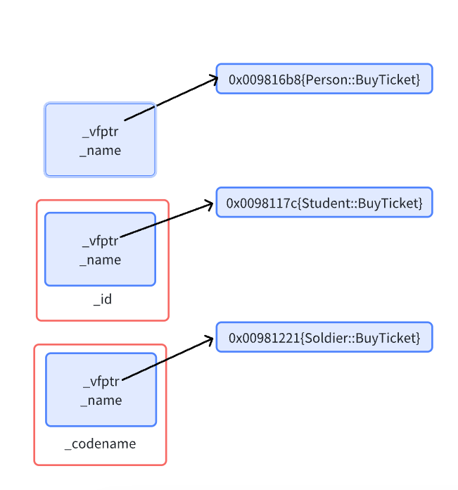 - 派生类中重写的基类的虚函数,派生类的虚函数表中对应的虚函数会被覆盖成派生类重写的虚函数地址