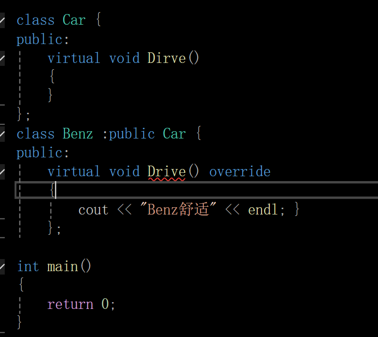 // error C3248: "Car::Dirve": 声明为 "final" 的函数不能由 "Benz::Dirve" 重写