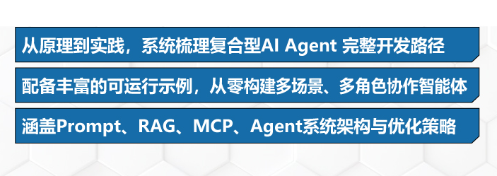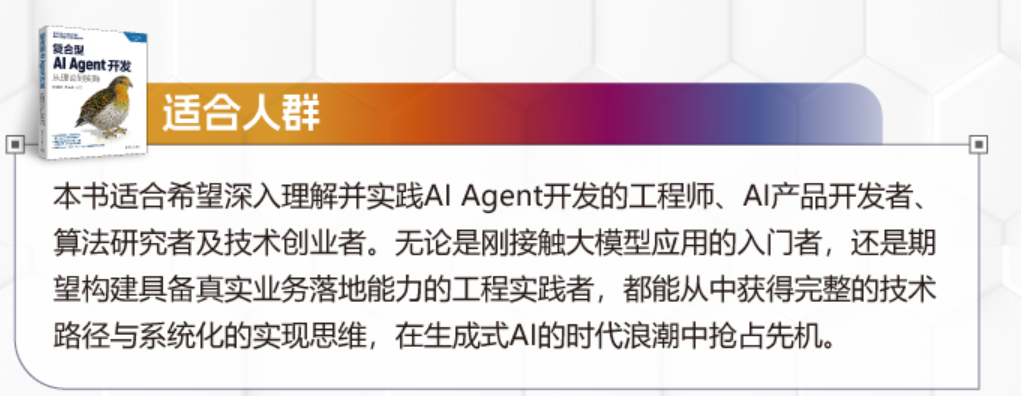 复合型AI Agent开发的学习者,背景差异较大------既有刚接触大模型的入门者,也有具备一定经验的算法研究者、工程实践者,还有寻求技术突破的创业者。《复合型AI Agent开发:从理论到实践》一书,通过分层设计的内容的与示例,满足不同人群的需求。