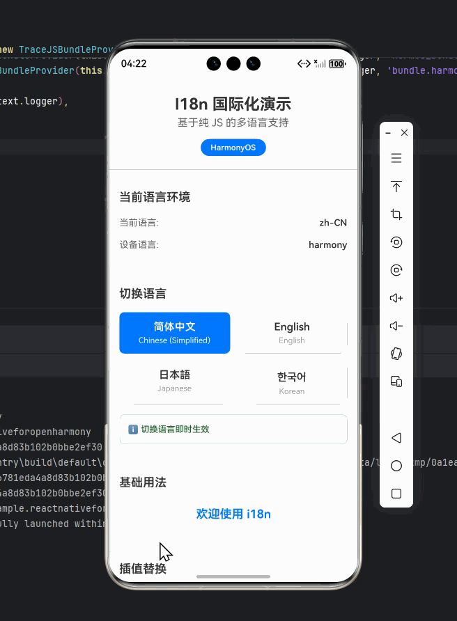 此处应有OpenHarmony设备运行截图,显示多语言切换效果