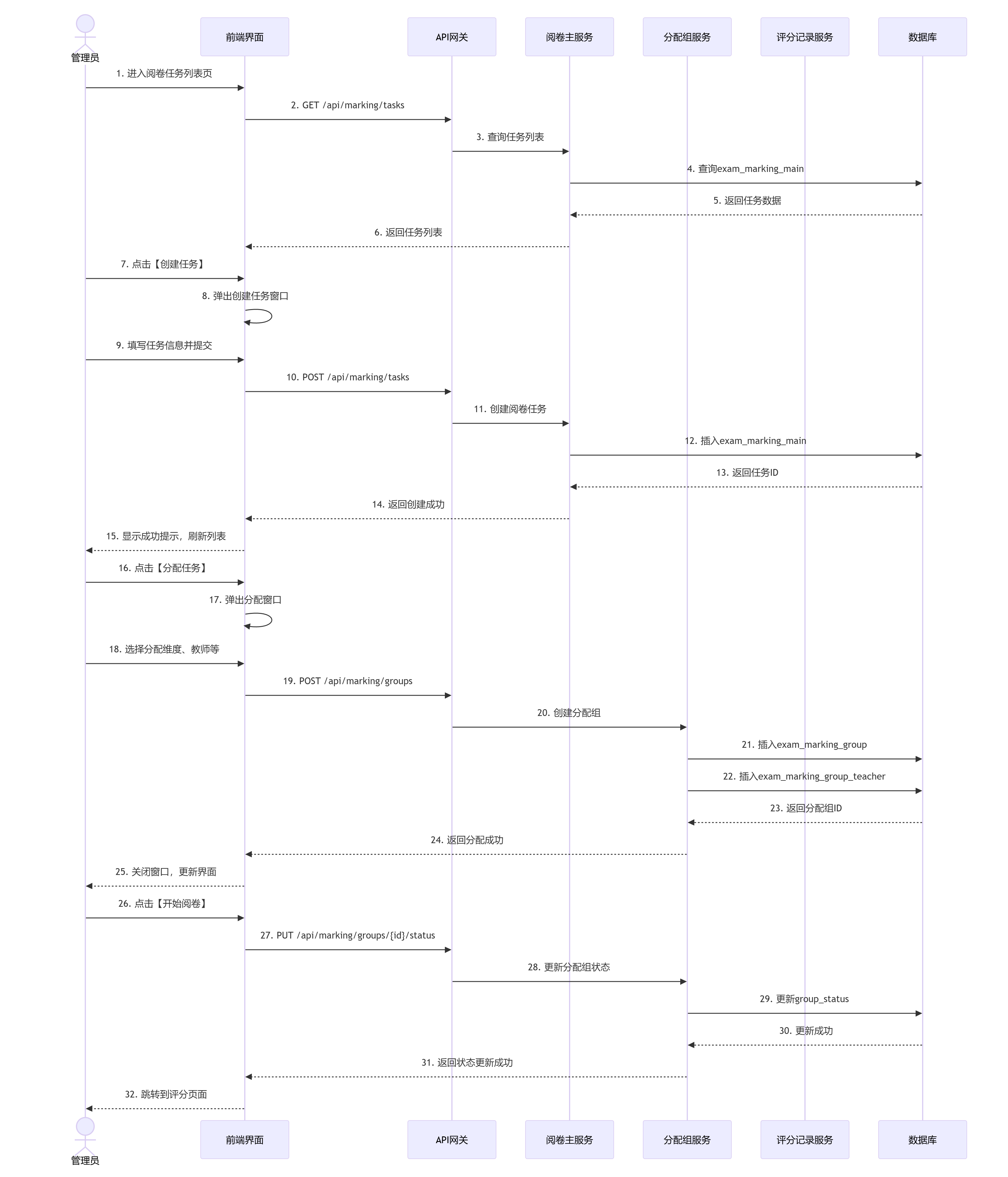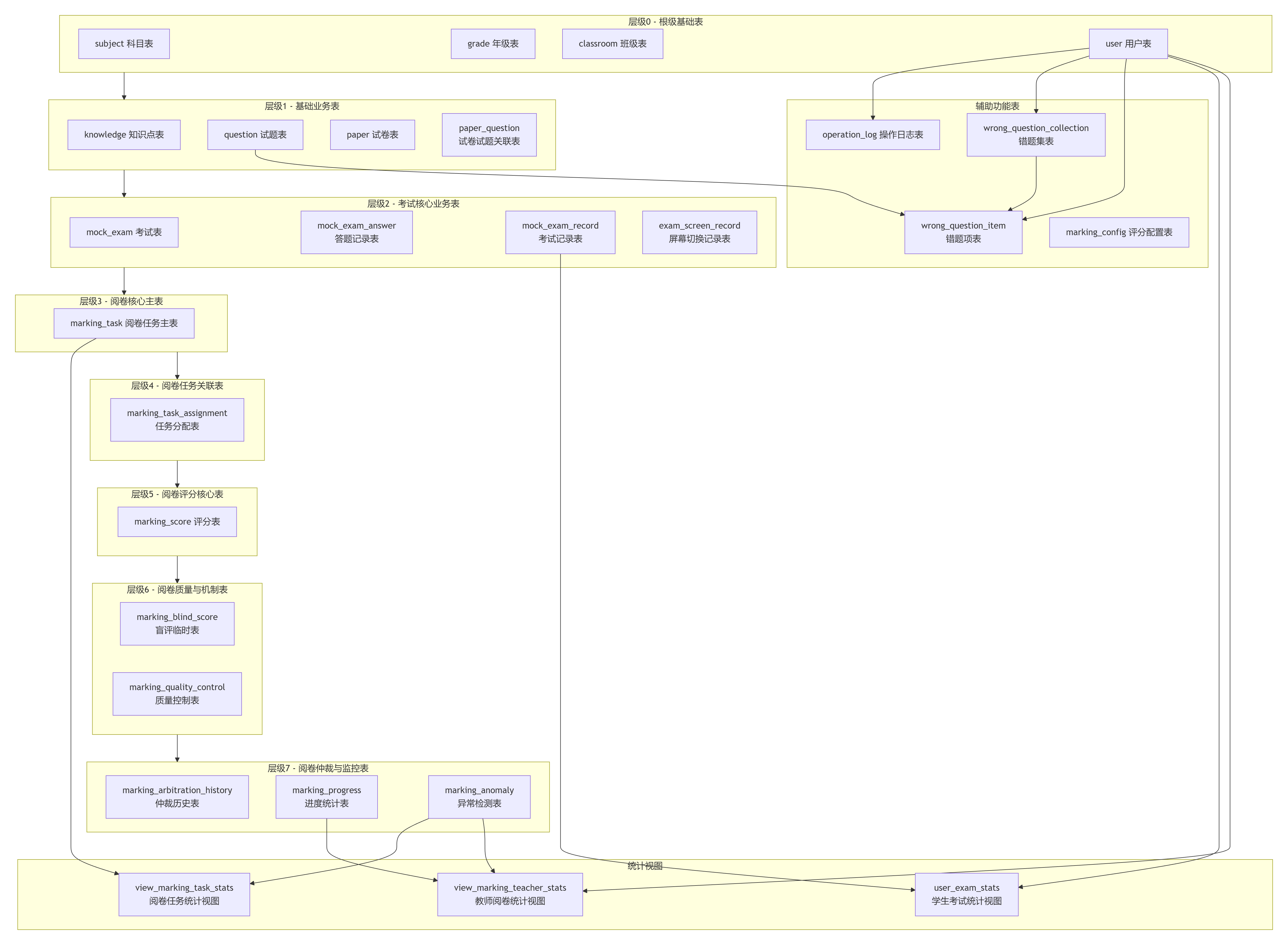 4. 智能阅卷:创建阅卷任务(marking_task) → 分配教师(marking_task_assignment) → 双盲评分(marking_blind_score) → 质量监控(marking_quality_control)