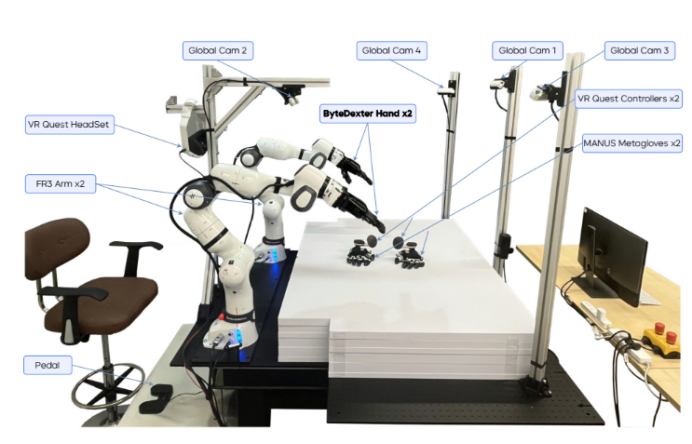 GR-Dexter系统采用了一套极具竞争力的双臂灵巧操作平台。其核心架构由两台 Franka Research 3 (FR3) 机械臂组成,每台机械臂末端集成了一只ByteDexter V2灵巧手。