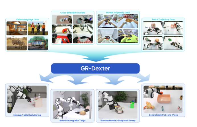 GR-Dexter采用了一个拥有40亿参数的VLA模型。该模型将四台摄像头(其中三台俯瞰FR3工作区,一台固定在FR3基座上方)捕获的视觉信息与语言指令相结合,实时输出FR3的关节动作。
