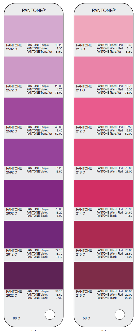 在包装印刷中,通常会预先混合几种油墨来调制出所需的颜色,这种颜色称为专色( spot color**)**。这种颜色使用单独的印刷单元印刷到纸张上。设计师和印刷厂之间通常使用按色相排列的专色色卡(扇形色卡)以及相应的油墨配方来沟通颜色信息。最常用的油墨混合系统是Pantone 配色系统(简称 PMS)。Pantone系统基于 14 种原色油墨。使用Pantone系统可以获得的颜色范围比使用青色、品红色、黄色和黑色油墨所能获得的颜色范围要大得多。图 3.22 显示了Pantone色卡中的几页。每一种颜色都有一个数字编号和相应的油墨配方。PMS 系统的普及催生了许多其他产品,例如四色印刷、荧光油墨和金属油墨、染色纺织品以及着色塑料。