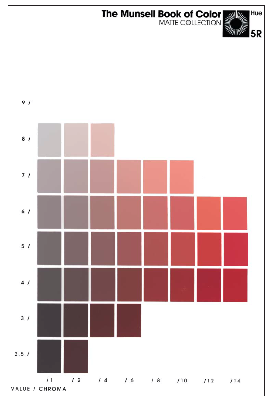 最初的色谱图在广泛的视觉实验基础上进行了大量的改进和发展。第一次改进包括采用更符合视觉感知的均匀值标度( Godlove 1933;Munsell,Sloan 和 Godlove 1933),以及改进色相和色度的间距(Berns 和 Billmeyer 1985)。为了避免混淆,修订后的色谱图重新命名为 Munsell 色彩手册(Munsell 1929)。在 20 世纪 30 年代末,人们发现视觉间距还可以进一步改进。美国光学学会的一个小组委员会使用更先进的实验技术进行了进一步的视觉实验,总共进行了超过 30 万次观察( Newhall 1940 )。他们没有制作色谱图,而是使用比色法来定义 Munsell 系统,并将数据发表在《美国光学学会杂志》上(Newhall,Nickerson 和 Judd 1943)。( 我们在第 4 章描述了比色法及其在颜色规范中的应用。) 可以使用不同的材料制作色谱图,并且已经有人使用哑光和光泽涂料、纺织品和喷墨打印技术制作了不同版本的色谱图。图 3.16 显示了哑光系列中的一个示例页面。