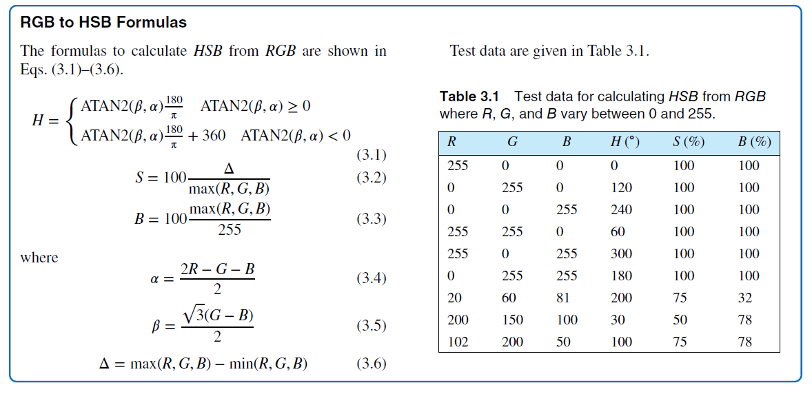 使用红、绿、蓝三个分量来选择颜色并不直观,需要练习才能掌握 。为了解决这个问题,可以将 RGB 颜色系统转换为使用更熟悉术语的系统;最常用的是色相(Hue)、饱和度( Saturation ) 和亮度( brightness ) :HSB 。颜色以极坐标圆柱坐标系排列,如图 3.20 所示。尽管"亮度"和"饱和度"与它们在上述定义中的真实含义略有不同,但该系统非常易于使用。