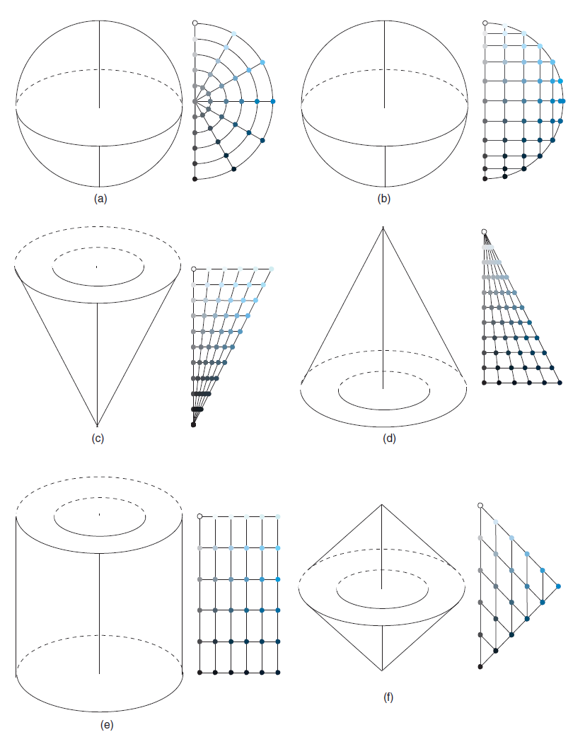 -----------图 3.8:三维颜色排列:球体,分别采用 (a) 球坐标或 (b) 极柱坐标;圆锥体,(c) 顶点为黑色或 (d) 顶点为白色;(e) 圆柱体;以及 ( f ) 双锥体。---------