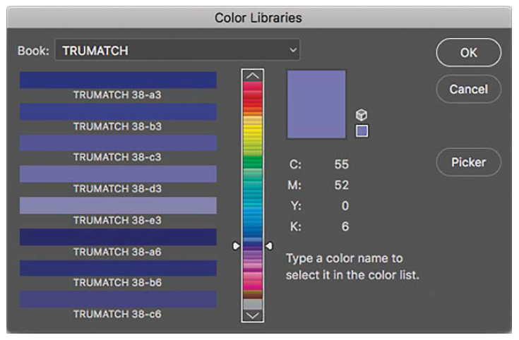 除了Pantone色卡之外,还有其他色彩系统,例如 DIC、FOCOLTONE、HKS、TOYO 和 TRUMATCH。这些系统也用于颜色选择器中,用于选择和定义颜色,如图 3.23 所示。