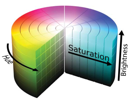 那么饱和度 (saturation)是什么呢?**它是物体颜色相对于其亮度的鲜艳程度,相当于色度相对于明度。**这是一种圆锥形(conical)排列,黑色位于锥顶(apex)。