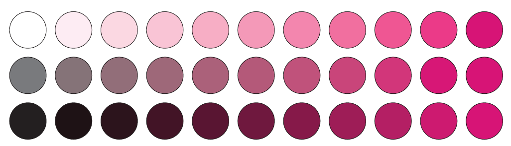 第三个心理属性是色度强度,定义为颜色总量 (amount)。图 3.6 展示了洋红色与白色、灰色或黑色混合时的色度强度变化。从左到右,色度强度逐渐增加。与白色和黑色的混合体在明度上也发生变化,而与灰色的混合体则保持恒定的明度。