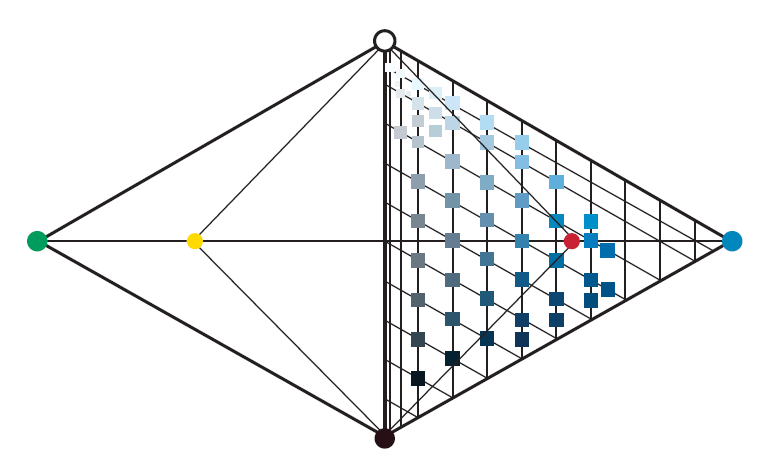 NCS系统呈双锥体结构,顶部为NCS白色,底部为NCS黑色,NCS色度从中心无色轴向外辐射,如图3.10所示。每一种色相都具有相同的最大色度,这可以理解为对每一种色相固有色强度的归一化( Nayatani 2005)。在恒定黑度(或白度)下对三维空间进行分片,即可得到色相环 。一个刺激或激励( stimulus ) 的色相定义为相邻基本色之间的百分比。例如,介于基本黄色(100Y)和红色(100R)之间的色相表示为Y10R,Y20R,......,Y90R,其他三个色相象限也以此类推。Y10R表示90%的黄色和10%的红色。