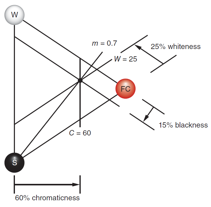 -----------------------图 3.11:NCS颜色三角形。颜色三角形上的一个点代表NCS色相。从连接白色( W )和黑色(S-swarthiness)的直线到纯色( FC-full color ) 的距离定义了色度C。从连接白色和特定色相的直线到黑色的距离定义了黑度S 。从连接黑色和纯色色相的直线到白色的距离定义了白度W 。还可以计算NCS饱和度m(源自瑞典语mättnad),其等于C/(C + W)。-------------------------------------