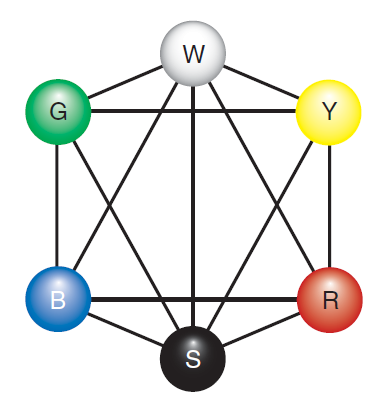 NCS 的指导原则是根据颜色与 Hering **基本色的相似程度来定义颜色,并以百分比表示。**如图 3.9 所示,基本色可以排列成一个六边形,其展示了根据Hering的对立色理论允许的颜色组合。例如,基本色蓝色与绿色、红色、白色和黑色相连。蓝色不与黄色相连,同样,红色也不与绿色相连。作为对立的基本色,不可能存在偏黄的蓝色、偏蓝的黄色等等。