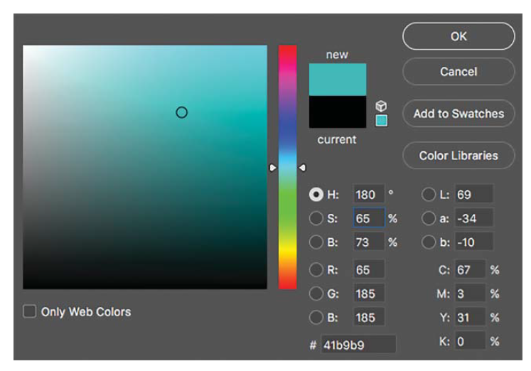 HSB 在 Adobe Photoshop 中用作颜色选择器,如图 3.21 所示。除了 RGB 和 HSB 之外,颜色还可以用 LAB(详见第 4 章)和 CMYK 来定义。将颜色转换为这些描述符需要用到颜色管理技术,详见第 10 章。