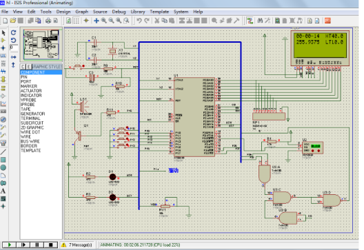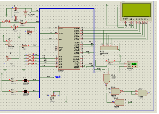 运用Proteus和Keil协同仿真,确保Proteus具有编译C语言的实力,软硬件部分协同模拟体系,包含1个硬件协同模拟机体系和1个硬件实施环境,一般情况下,软硬件部分均具有自身的调控页面,Keil和Proteus的重组调试能够完成体系的总调,在这个体系内,keil是软件部分调试的页面,Proteus是硬件部分模拟与调试的页面。温度显示模块的调试图如图5-2所示。