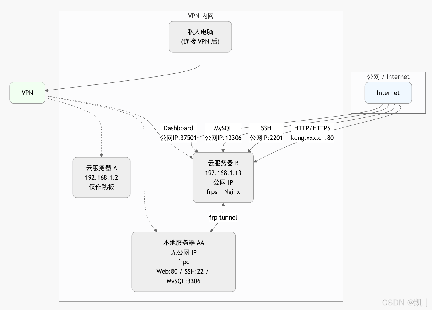 frp(frp 是 Fast Reverse Proxy 的缩写)是一个轻量、高效的内网穿透工具,可以将内网的 SSH、Web、MySQL 等服务安全地暴露到公网。本文基于一个实际生产环境,介绍 frp 的安装、配置和使用方法,实现: