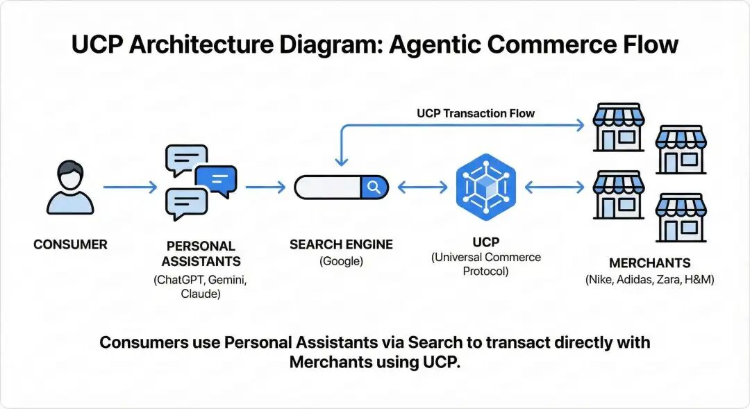 2026年1月12日,在全美零售联盟大会上,谷歌联合Shopify、Etsy、沃尔玛、Target、Wayfair等全球零售巨头,正式开源 通用商务协议(Universal Commerce Protocol, UCP)。这一举措被业界称为"电商领域的MCP时刻"------意指UCP有望像MCP协议在AI工具调用中扮演的角色一样,成为AI原生电商生态的底层"通用语言"。