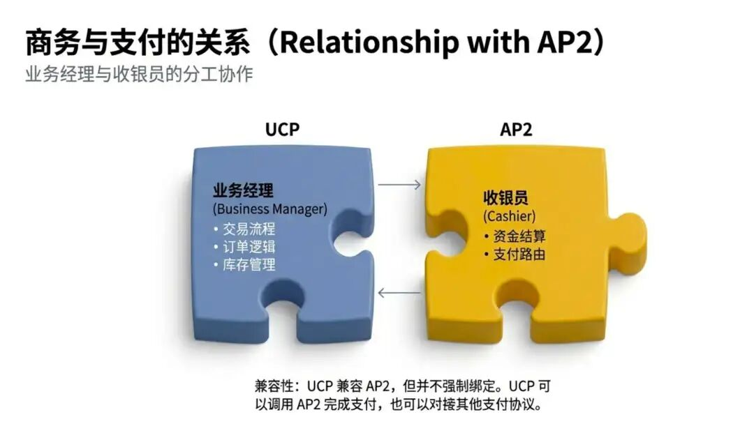 AP2解决了支付的问题,UCP解决的是商务的全链路,并且UCP是兼容AP2的,可以将AP2作为UCP的支付协议,当然也可以不使用AP2。