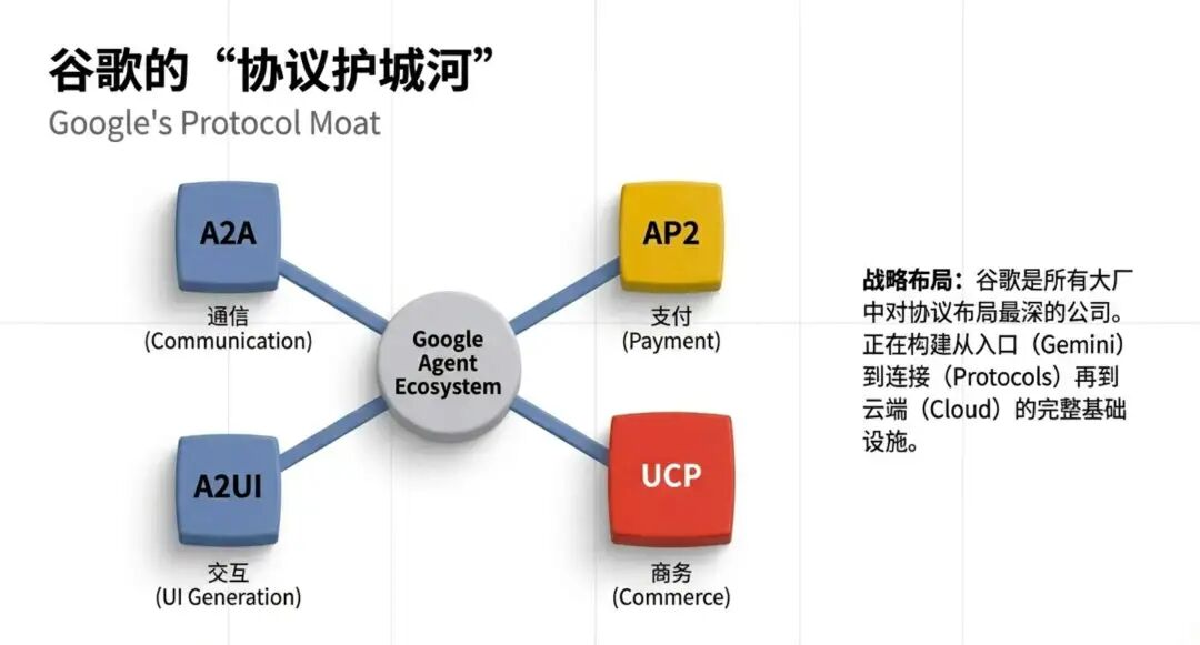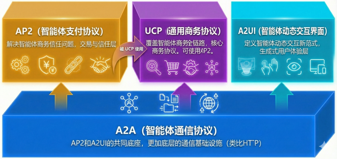 UCP并非孤立存在,而是构建在谷歌已有的AI协议生态之上: