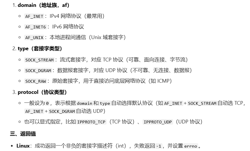 socket函数的作用是创建一个套接字描述符(文件描述符),这个描述符是后续进行网络通信(绑定、监听、连接、收发数据)的唯一标识。