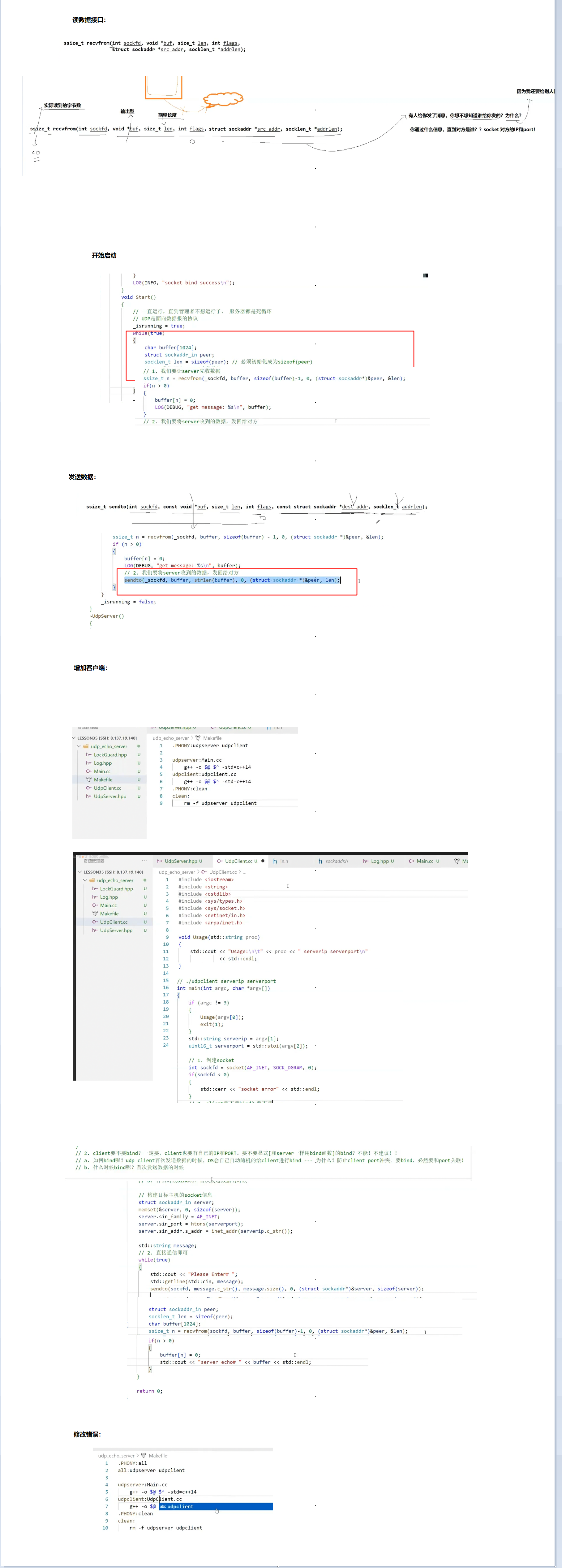 cpp#pragma once #include<iostream> using namespace std; #include<sys/types.h> #include<sys/socket.h> #include<strings.h> #include<cstdlib> #include <netinet/in.h> #include <arpa/inet.h> // 提供 IP 地址转换函数(如 inet_pton()、inet_ntop()、inet_addr()) const static int defaultfd = -1;//套接字默认值,-1代表创建失败 class UdpServer { public: //需要外部传入port,ip UdpServer(uint16_t port,const string& ip):_sockfd(defaultfd),_port(port),_ip(ip) {} //初始化一个socket套接字 void InitServer() { _sockfd = socket(AF_INET,SOCK_DGRAM,0); if(_sockfd < 0) { cout<<"创建失败"<<endl; exit(1); } //创建成功后,填充sockaddr结构 struct sockaddr_in local;//struct sockaddr_in 是系统提供的数据类型,local是变量,属于用户在栈上开辟的空间(类似于int a = 100;) bzero(&local,sizeof(local));//对一份空间清零 local.sin_family = AF_INET; local.sin_port = htonl(_port);//port要经过网络传输给对面,必须先到网络,而网络是大端序 //对于ip,我们需要注意两点: //a:要把字符串风格的点分十进制的IP地址转换成4字节IP地址 //b:要将主机序列转换成网络序列 //上述两点只需要一个函数可以同时进行:inet_addr local.sin_addr.s_addr = inet_addr(_ip.c_str()); } void start() { } ~UdpServer() { } private: int _sockfd; uint16_t _port; string _ip;//暂时先这样写(不是必须的) };
