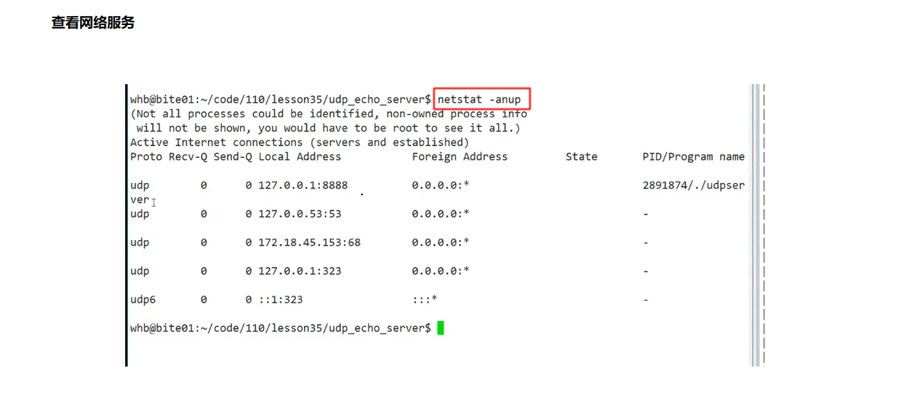 cpp#pragma once #include<iostream> using namespace std; #include<sys/types.h> #include<sys/socket.h> #include<strings.h> #include<cstdlib> #include <netinet/in.h> #include <arpa/inet.h> // 提供 IP 地址转换函数(如 inet_pton()、inet_ntop()、inet_addr()) const static int defaultfd = -1;//套接字默认值,-1代表创建失败 class UdpServer { public: //需要外部传入port,ip UdpServer(uint16_t port,const string& ip):_sockfd(defaultfd),_port(port),_ip(ip) {} //初始化一个socket套接字 void InitServer() { _sockfd = socket(AF_INET,SOCK_DGRAM,0); if(_sockfd < 0) { cout<<"创建失败"<<endl; exit(1); } //创建成功后,填充sockaddr结构 struct sockaddr_in local;//struct sockaddr_in 是系统提供的数据类型,local是变量,属于用户在栈上开辟的空间(类似于int a = 100;) bzero(&local,sizeof(local));//对一份空间清零 local.sin_family = AF_INET; local.sin_port = htonl(_port);//port要经过网络传输给对面,必须先到网络,而网络是大端序 //对于ip,我们需要注意两点: //a:要把字符串风格的点分十进制的IP地址转换成4字节IP地址 //b:要将主机序列转换成网络序列 //上述两点只需要一个函数可以同时进行:inet_addr local.sin_addr.s_addr = inet_addr(_ip.c_str()); //开始bind 绑定sockfd和网络信息(IP+Port) int n = bind(_sockfd,(struct sockaddr*)&local,sizeof(local)); if(n < 0) { cout<<"绑定失败"<<endl; exit(1); } cout<<"绑定成功"<<endl; } void start() { } ~UdpServer() { } private: int _sockfd; uint16_t _port; string _ip;//暂时先这样写(不是必须的) };