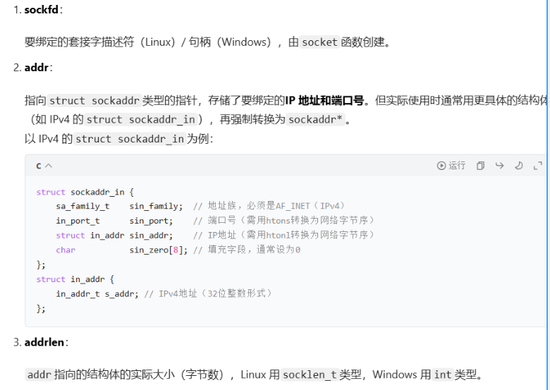 bind函数是将套接字与特定的 IP 地址和端口号绑定的核心函数,只有绑定后,套接字才能监听(服务端)或发起连接(在客户端中,部分场景可选)