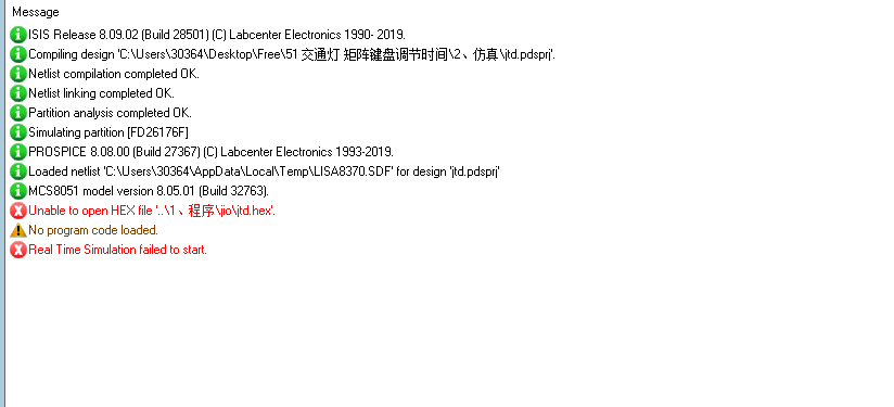 proteus仿真如果出现下图情况,原因是未加载'hex'文件,也就是没烧录程序。