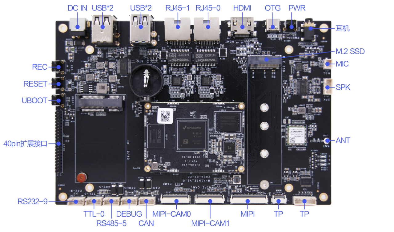 M-K1HSE V1.0开发板采用进迭时空K1(RISC-V SpacemiT X60)八核处理器,搭载Harmony系统,主频高达1.6GHz,超强性能,接口丰富。采用IMG BXE-2-32@819MHz GPU,32KB SLC,支持4K、H.265/H.264硬解码,无论是跑分还是解码都是一流,是您在人机交互、工控项目上的新选择。