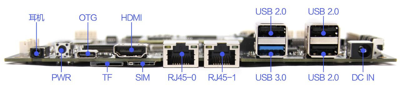 丰富的扩展接口.5个USB接口(1个USB3.0,3个标准USB口,1个type-C OTG),5路串口(3路TTL,1路RS232,1路RS485)以及多个GPIO,可以满足市场上各种外设的要求.