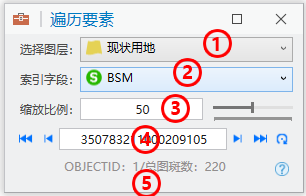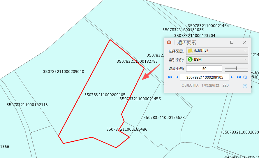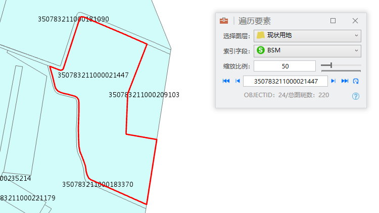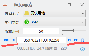 用地显示当前图斑的OBJECTID,和图斑总数。