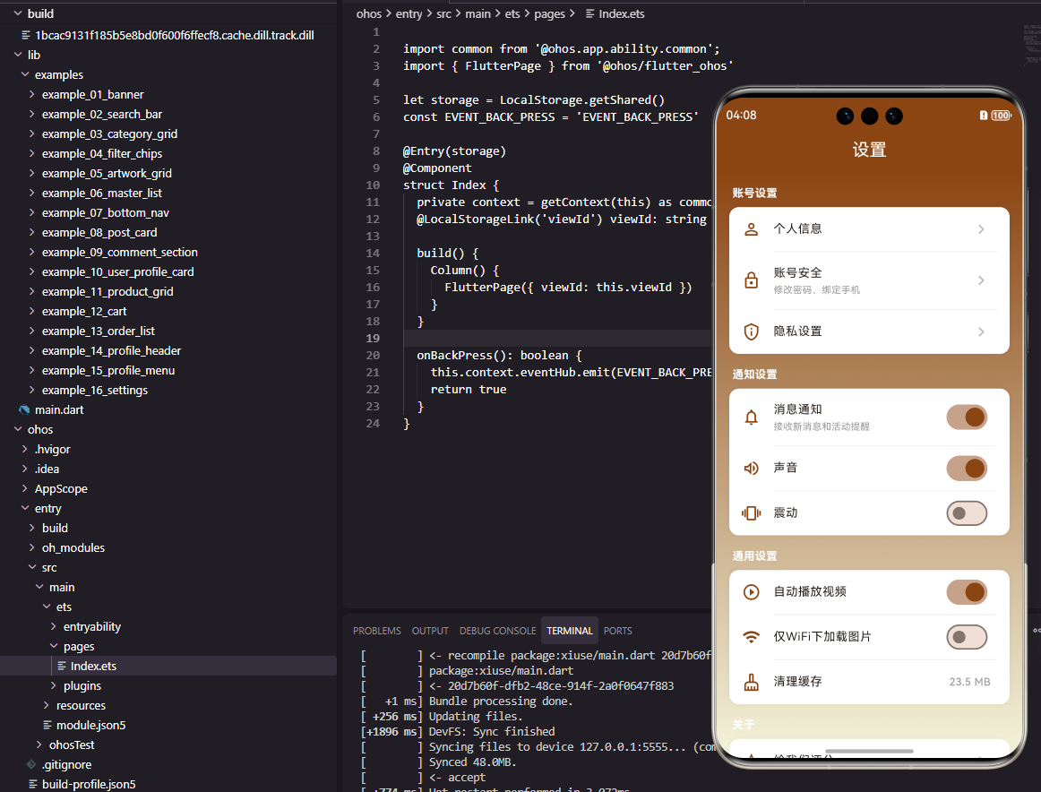 在Flutter中,我们使用StatefulWidget来管理设置项的状态变化,确保UI能够及时响应用户操作。特别需要注意的是,在OpenHarmony平台上,状态管理需要与鸿蒙的响应式机制兼容。