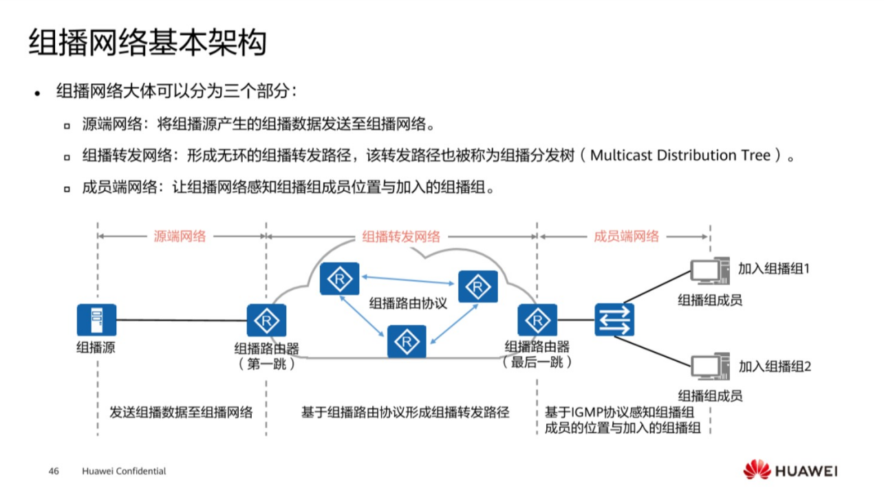 第一个组播源到组播的第一跳路由器,也就是说数据源将这个数据推送到组播网络里面,然后沿着组播网络架构,将数据发送到组播的最后一跳路由器,然后最后一条路由器根据想要接收的成员,将这样的一个组播数据推送到相关的接收者里面,这样在一起就形成了整个组播数据流,从源到接收用户的一个架构,其中在组播转发网络里面需要通过组播路由协议,去保证组播路由的转发,同时没有环路的形成,常见的就是PIM协议。组播成员如何去判断自己想要接受哪个组播的数据,这个时候就需要通过IGMP协议去实现。