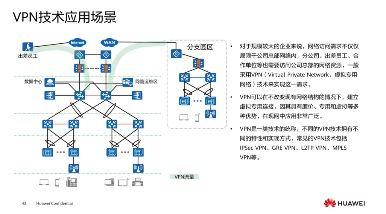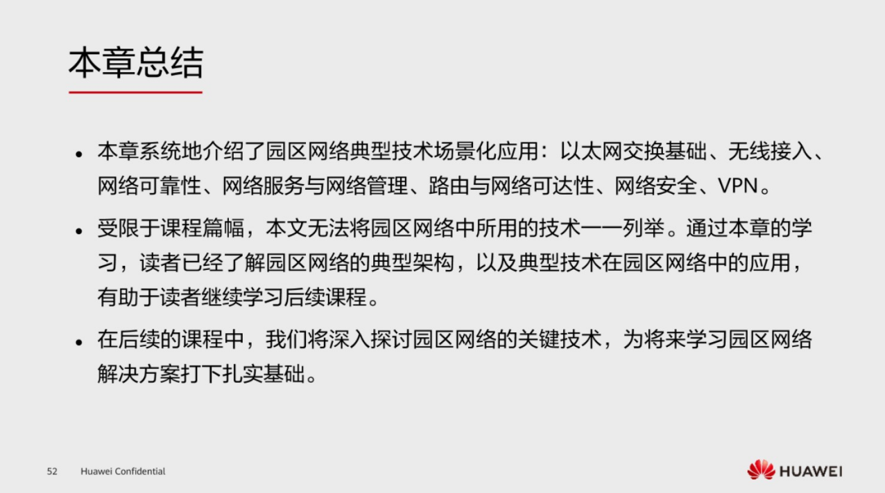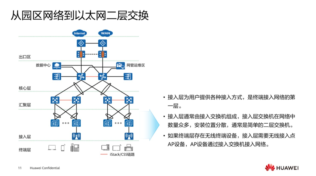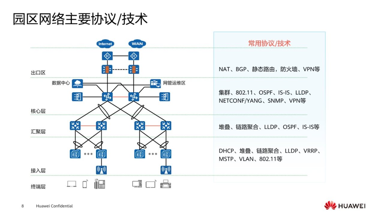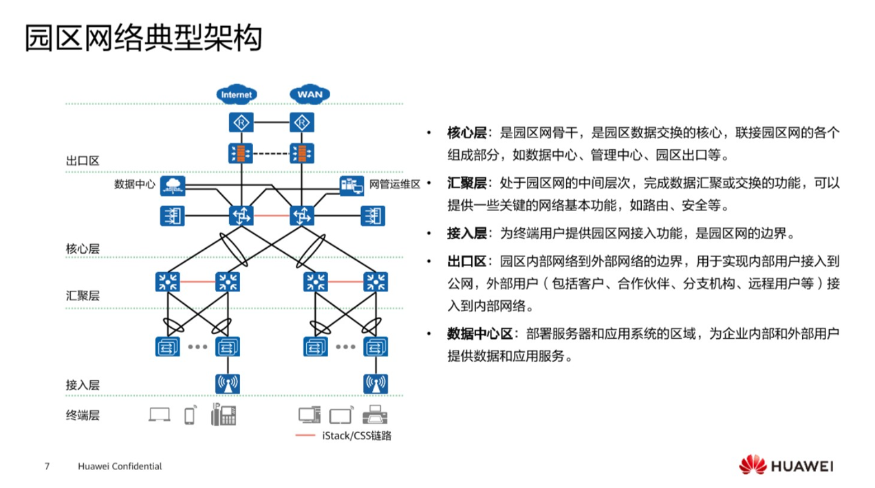 核心层是一个具备高速转发流量的这样的一个层,而汇聚层一般是处于园区的中间层次,它一般起到了一个起上达下的这样的层面,接入层一般是为终端用户提供一个接入这样的的功能,这三大层是网络里面非常常见的组成成分,再到后面就是园区网络的出口,出口处一般是连接外部网络,是为园区内的内部用户提供访问外网的能力,第二个可能考虑到,比如说一些员工出差,也有一些需求想要访问总公司的这样的一个资源,那么在出口处也要做相关的策略。再到最后是数据中心区,一般是用来存放一些服务器去使用的,在不同的层次它会有不同的应用技术。